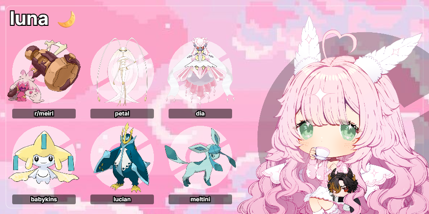 Hi! I'm Luna. I'm 28 y/o, identify as a paragirl, and have been in a loving monogamous relationship with my darling since October 3rd 2023.I enjoy roleplay, art, character design/development, cute aesthetics, plushies, cats, and videogames.I have extreme anxiety as well as autism. There is a lot more going on in my head than that, but those two tend to explain a lot of my behaviors. I don't mind what pronouns you refer to me as, as long as they are not insulting! I'm fine with neopronouns, too! My favorite neos for myself are fae/faeself.My favorite games are FFXIV, Faaast Penguin, Rune Factory and other similar farming sims, Pokemon Z/A, Umamusume, and Palworld.